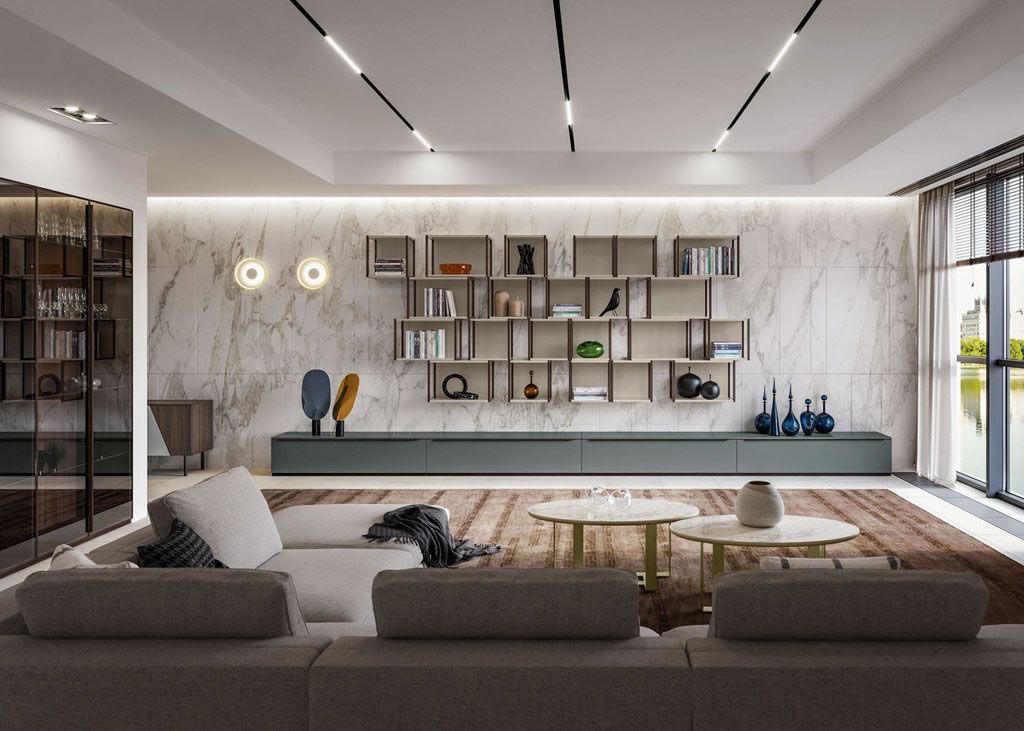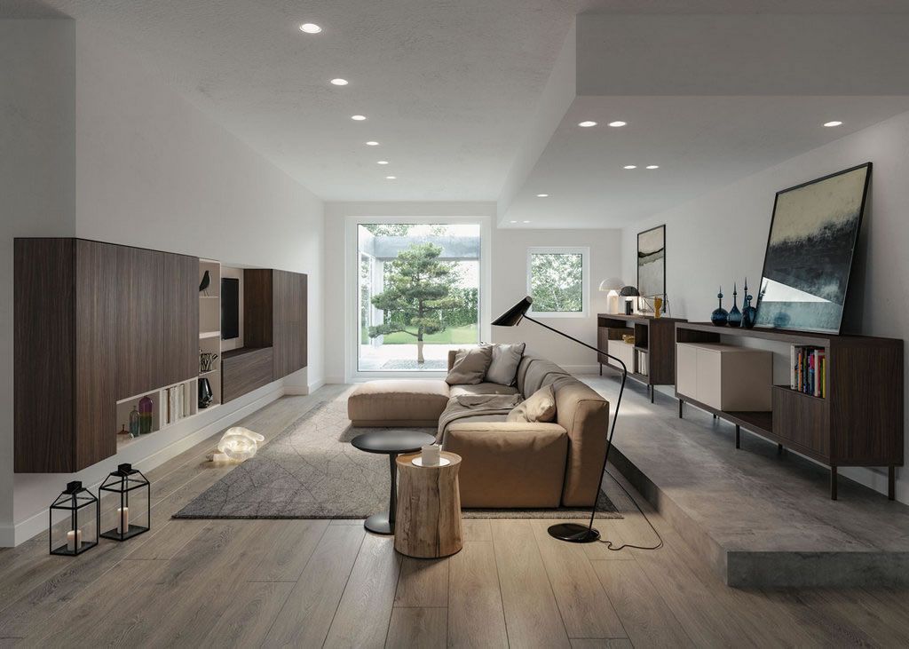 Infine, in una zona living contemporanea non si dovrebbero mai trascurare l’illuminazione e l’effetto della luce sull’ambiente.